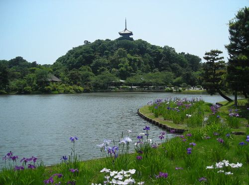 菖蒲の花満開と三重塔 |